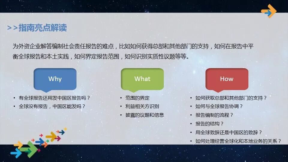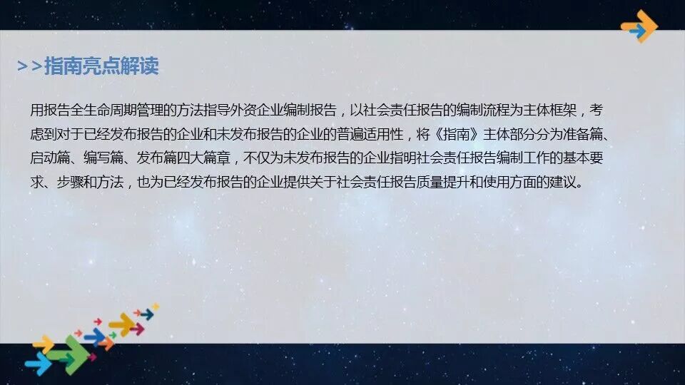 2017年外商投资企业社会责任实践指数样本来自68家在华外商投资企业的73个社会责任优秀实践案例。同比去年,参与社会责任优秀实践案例的外商投资企业增加了14家,共计18家企业连续四年参加案例评估。 该报告表明,在华外商投资企业在新时期更加积极融入中国发展脉动,不断创新责任管理和服务,主动贡献中国绿色发展,坚持以人为本、关爱员工及回馈社会等方面的努力和成效。 该报告还提出了相关建议,希望在华外资企业能够继续融合和创新,发挥企业专长,注重价值均衡,开展有效沟通。 会上,中国外商投资企业协会正式发布《中国外商投资企业社会责任报告编写指南》(以下简称《指南》)。据悉,该《指南》旨在引导外资企业重视社会责任报告的作用,鼓励和促进更多外资企业定期、持续发布社会责任报告。 《中国外商投资企业社会责任报告编写指南》发布 中国外商投资企业协会一直高度重视外资企业履行社会责任。在中国外商投资企业协会的支持下,2017年5月,中国外商投资企业社会责任工作委员会正式成立,明确提出通过编写和发布《指南》,以推进外资企业履责和信息披露更加规范化、标准化。 工信部政策法规司副巡视员郭秀明致辞 工信部政策法规司副巡视员郭秀明在致辞中表示,在十九大以后的新时代,对外资企业社会责任报告的要求也越来越高,《指南》的发布能够极大地推动广大的外资企业积极发布社会责任报告,利用好社会责任报告的沟通功能,主动、坦诚、透明地与各利益相关方进行沟通。 中国外商投资企业协会副会长李玲致辞 中国外商投资企业协会副会长李玲在致辞中回顾了近年来外资企业在社会责任方面的进展,分析了当前外资企业面临的新形势、新挑战和新机遇,总结了目前外企在社会责任信息披露方面存在的问题,并提出了改进措施和建议。 李玲指出,当前,中国进入中国特色社会主义新时代,中国社会各界对于企业披露社会责任信息的呼声越来越高。希望外资企业认清形势,改变观念、改变思想、改变方法,提升披露意识,学会讲好故事。 她建议,今后各外资企业能够用好《指南》,编好、用好社会责任报告,全面系统地和利益相关方沟通,赢得中国社会更广泛的信任和支持,提升责任品牌形象,更好地推动在中国的事业发展。 《WTO经济导刊》杂志社社长兼主编于志宏对《指南》进行了编写情况介绍和亮点解读,以及后续应用计划。《指南》主体部分分为准备篇、启动篇、编写篇、发布篇四大篇章,不仅为未发布报告的企业指明社会责任报告编制工作的基本要求、步骤和方法,也为已经发布报告的企业提供关于社会责任报告质量提升和使用方面的建议。 左右滑动查看图片 会议特意设置互动沟通环节,由玫琳凯(中国)有限公司副总裁、浙江省外商投资协会会长张晶主持,佳能(中国)有限公司涉外关系及企业品牌沟通部总经理鲁杰、三星(中国)投资有限公司CSR事务局总监孙贵峰、华晨宝马汽车有限公司企业社会责任高级经理杨新斌、沃尔玛(中国)投资有限公司企业社会责任负责人房莹,围绕要不要在中国发报告、报告的价值、报告编制标准等问题进行探讨。 4位企业代表在互动沟通环节进行探讨 他们认为,要按照高标准、高要求编制社会责任报告,主动披露外资企业在中国的履责实践和成效,以有效的方式与中国的利益相关方保持沟通,并向企业总部准确反映中国利益相关方的诉求和期望,提升履责实践,塑造企业品牌形象。 9家企业集体发布社会责任报告 松下电器(中国)有限公司交流推进部部长王爱强代表外资企业宣读倡议 会上,佳能(中国)有限公司、索尼(中国)有限公司、苹果公司、美国高通公司等9家外资企业现场集体发布社会责任报告,并共同发起了响应《指南》的倡议书。他们表示,将主动发布中国区社会责任报告,主动加强与中国社会的沟通,主动运用《指南》,重视社会责任报告的价值和作用,争做中国企业社会责任履责先锋,为深入推动在华外资企业的社会责任履责实践和整个中国经济社会的可持续发展贡献力量。