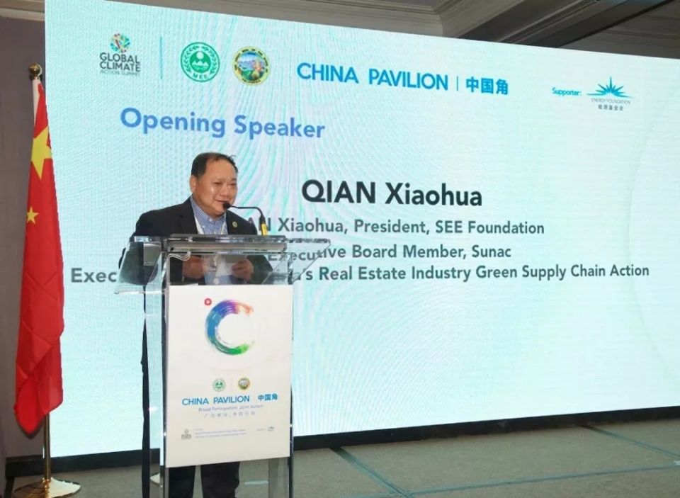 阿拉善SEE第六任会长、融创中国董事、“中国房地产行业绿色供应链行动”执行主任委员钱晓华在致辞中介绍了阿拉善SEE联合多家行业联盟和领头企业共同发起的“中国房地产行业绿色供应链行动”。该行动现在已有97家房地产企业加入,涉及供应商2千多家,作出了企业碳减排的重要贡献。他表示,“我们希望更多的企业一起携手,为全球的减排作出应有的贡献,履行我们中国企业的责任。”