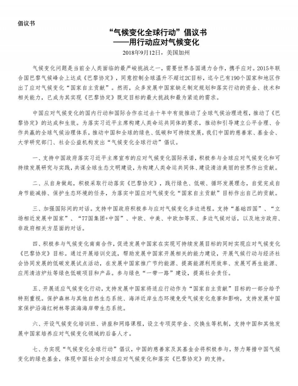 《巴黎协定》提出要控制全球升温幅度小于2℃的目标,为进一步落实《巴黎协定》框架下我国承诺的国家自主贡献目标,我们向工商企业、行业协会、环保公益组织、研究机构、媒体等社会各界发起倡议: