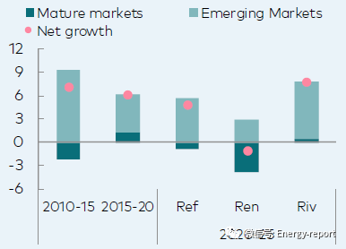 这些情景是未来的故事,说明了能源市场未来具有非常大的结果空间。其中两种情景,即改革和竞争,说明了如果当前能源市场、宏观经济和地缘政治发展没有发生重大变化,世界可能会走向何方。改革情景代表着技术发展和良性市场力量推动的未来,并得到能源和气候政策逐步收紧的支持。竞争情景描述了能源转型因缺乏信任、地缘政治重动和无法有效应对共同挑战而放缓的未来,就像今天这样。另一方面,改进情景显示了能源市场需要去哪里,为可持续的未来做出贡献。能源和气候政策的迅速和显著收紧、全球政治合作和快速的技术变革推动了全球碳排放的改进,提供了一条使全球能源相关碳排放量与在《巴黎协定》中远低于2°的目标保持一致的途径。