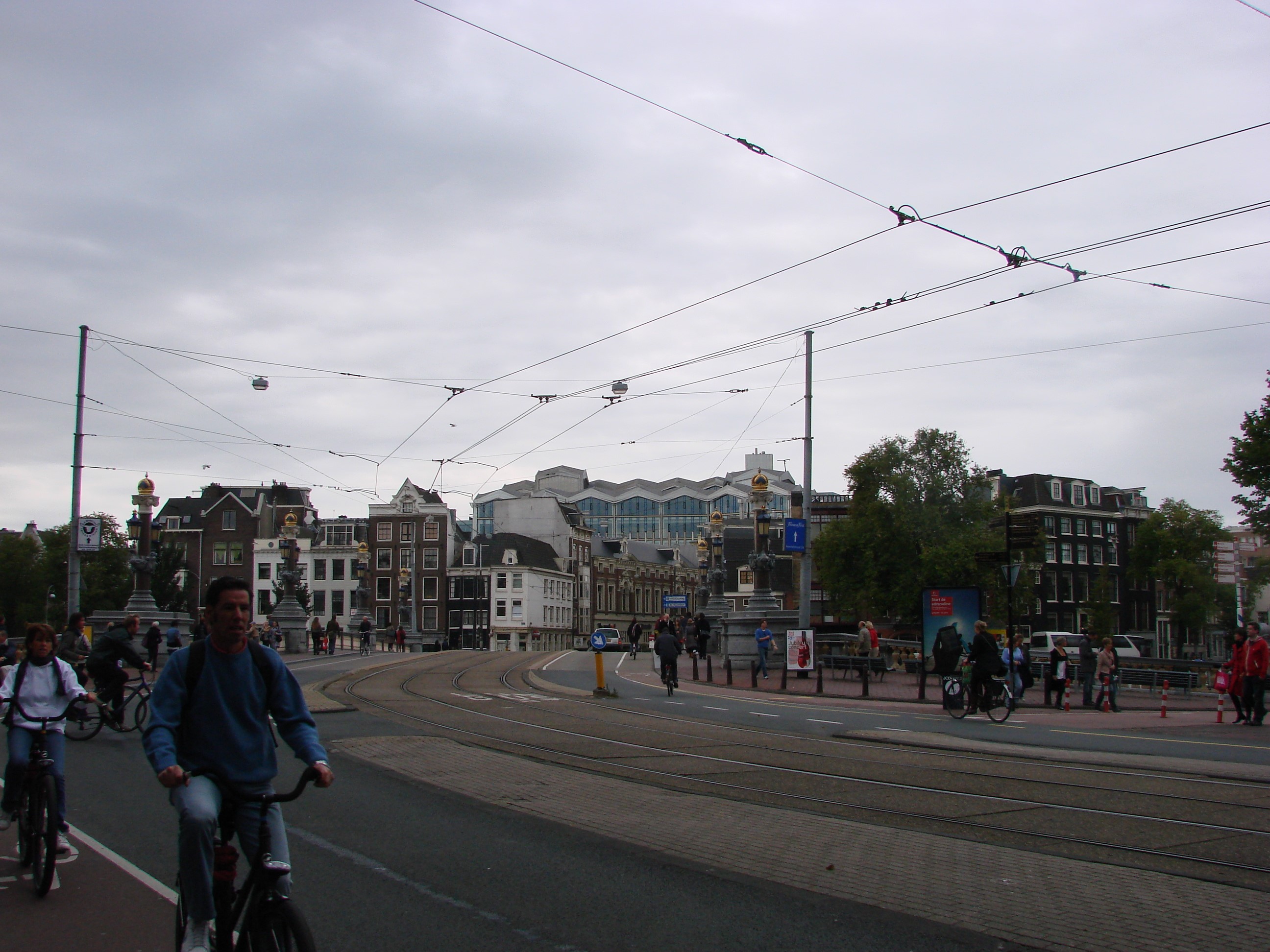 我们可以看阿姆斯特丹的街道,道路最中间是有轨电车道,两边是单向车道,红色的标有自行车标志的为自行车道,最边上是人行车道,可以看出,几乎没什么车,路上最主要的交通方式是自行车。