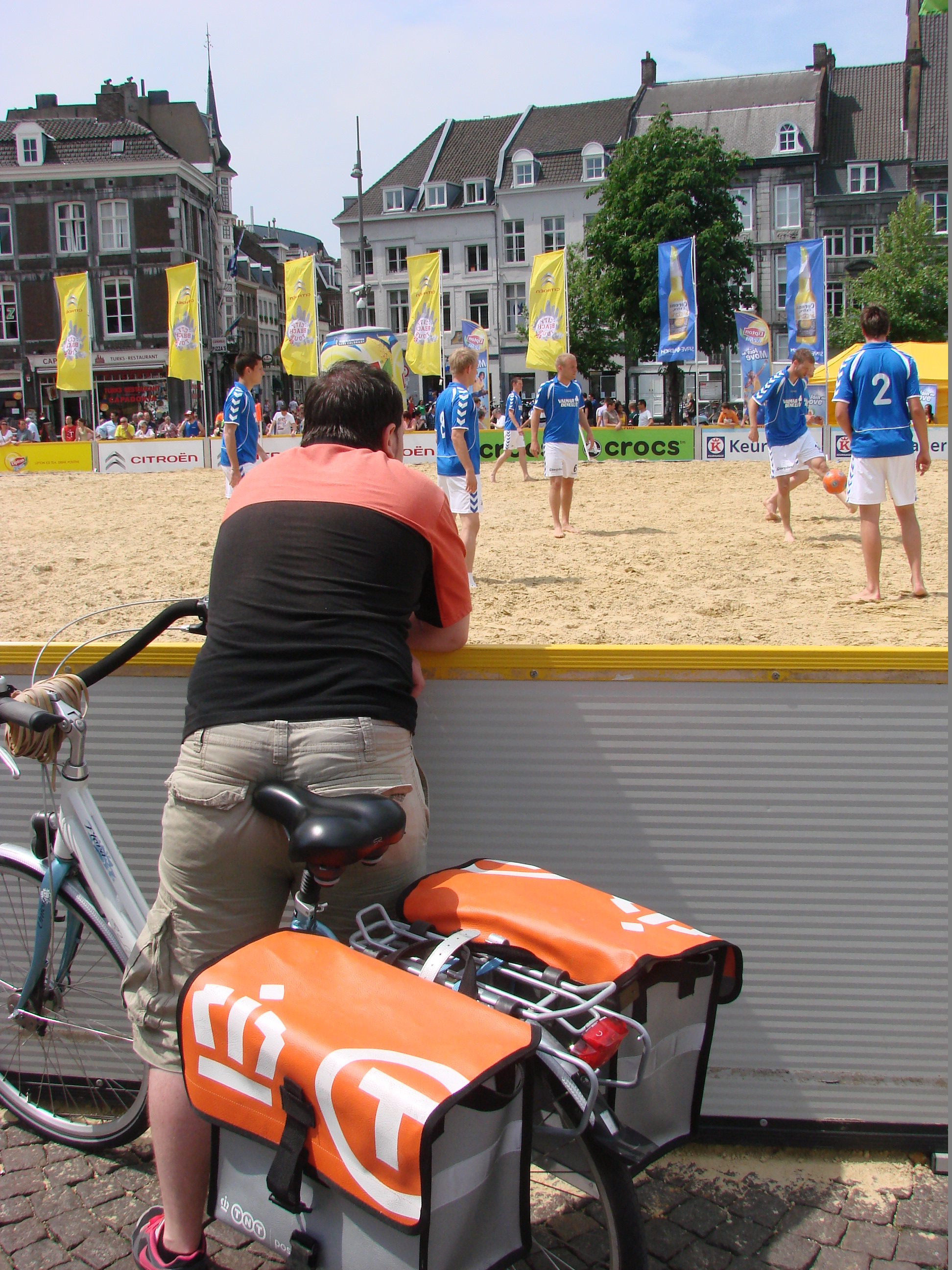 骑自行车的邮递员,休息时看沙滩足球比赛。邮递员自行车后座的袋子成为荷兰自行车的一个标志。