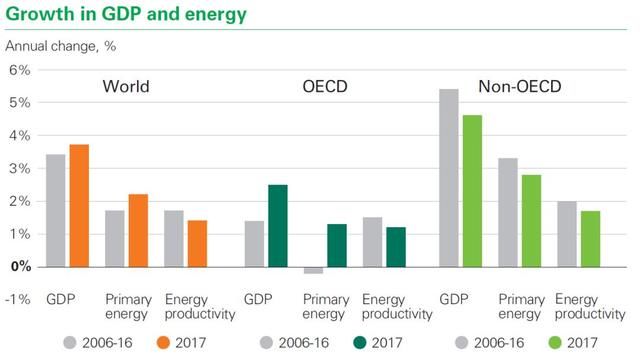 2017年,全球能源需求增长了2.2%,较2016年全球能源需求同比增长(1.2%)相比有所提高,同时也高于10年的均值1.7%。全球能源需求的增长由经合组织国家驱动,特别是欧盟。而欧盟能源需求的增长则直接归因于经济的持续复苏。同时,欧盟的能源需求也反映了能源强度的改善,即单位产出所需能源量下降。