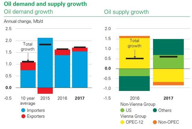 从供给方面看,产量的增长(60万桶/日)与2016情况相仿。但是带来增长的组成却大相径庭。在2016年增产160万桶/日之后,OPEC和其他维也纳组织成员国的产量在减产生效后,去年下降了90万桶/日;而维也纳组织外的国家产量增长了150万桶/日(美国和非维也纳组织成员国利比亚所引领)。