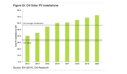 根据花旗银行的最新报告,2013-2020年全球每年需要安装53吉瓦太阳能光伏来应对危险的气候变化。