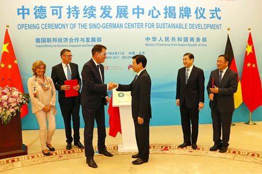 2017年5月11日,中德可持续发展中心揭牌仪式在京举行。商务部钟山部长和德国经济合作与发展部穆勒部长共同出席、致辞并为中心揭牌。德国驻华大使及使馆官员、德国经合部官员、德国国际合作机构代表,非盟轮值主席国代表、非洲驻华使团长、部分其他国家驻华使馆和机构代表,我部与农业部、国家能源局等部门及其他机构代表近百人参加。
