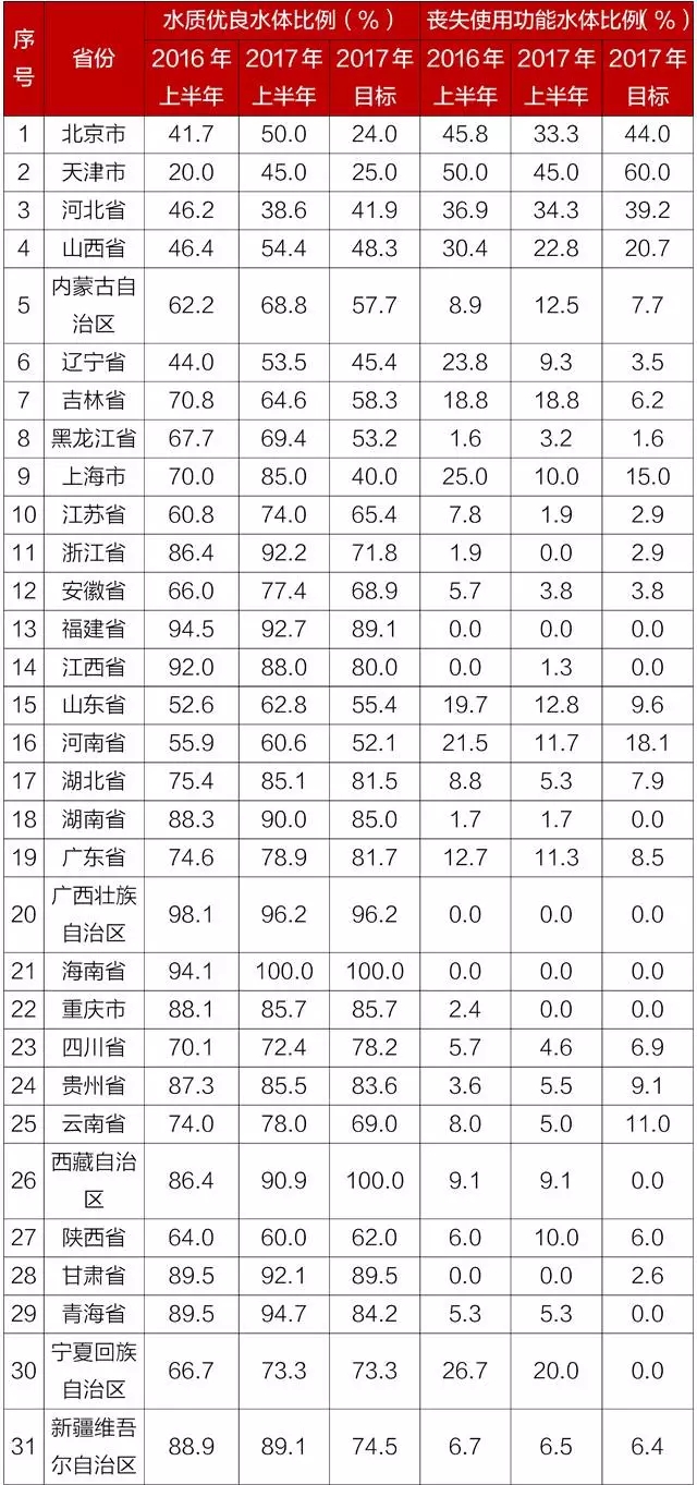 2017年上半年,全国地表水水质优良(I-III类)水体比例为70.0%(2017年目标为68.3%),同比上升1.2个百分点;丧失使用功能(劣于V类)水体比例为8.8%(2017年目标为8.4%),同比下降1.7个百分点。其中,河北、吉林、福建、江西、广西、重庆、贵州、陕西等8个省(区)水质优良(I-III类)水体比例同比下降;内蒙古、黑龙江、江西、贵州、陕西等5个省(区)丧失使用功能(劣于V类)水体比例同比上升(见附件1)。