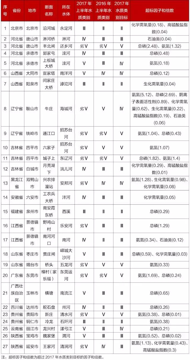 2017年上半年水质下降断面水质状况表