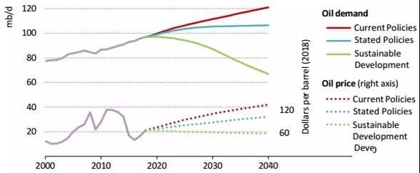 图1 2018-2040年不同情景下全球石油需求和价格变化态势(左轴单位:百万桶/日,右轴单位:美元/桶)