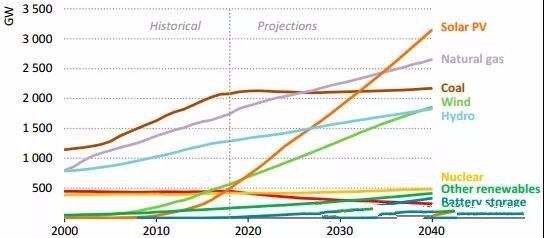 在既定政策情景中,太阳能光伏成为全球电力装机中占比最大的发电类型。2025年左右,可再生能源在发电结构中占比将超过煤炭,这主要得益于风能和太阳能光伏发电的持续增加。可再生能源在总发电量中占比将从2018年的26%增长至2040年的44%。风能和太阳能光伏发电增速最为抢眼,但水力发电仍占据可再生能源发电的主要份额,2040年占全球总发电量的15%。