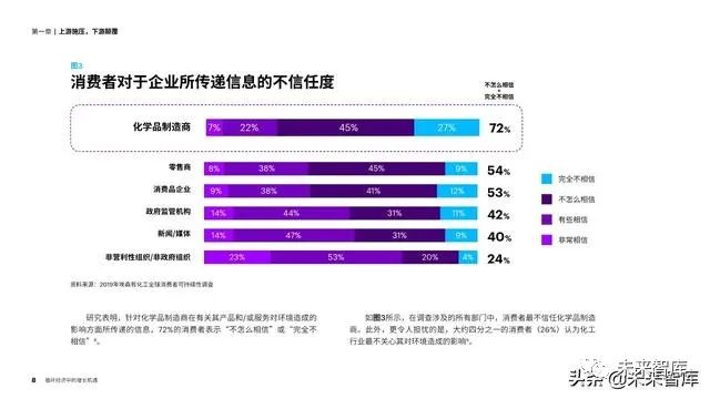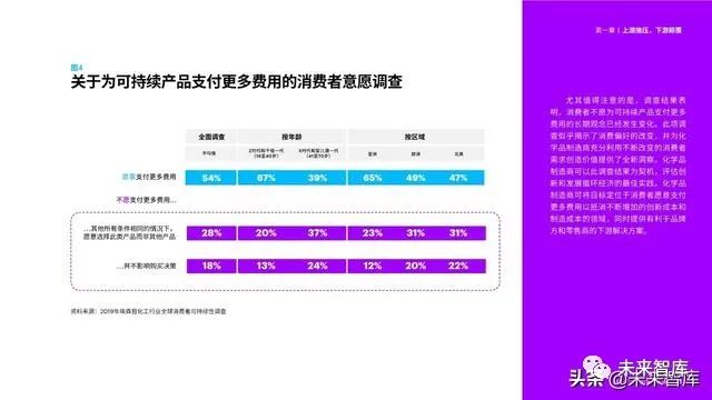 有限的全球资源和人们对可持续发展的日益关注 正在逐步改变全球消费者对于化学品的看法。他们在 社交媒体上呼吁品牌方和零售商采取行动,实行更加 负责任且有益于地球环境的企业管理。同时,他们也 在发挥购买力对企业决策的影响。根据埃森哲对11个 国家/地区的6,000名消费者开展的最新调研表明,超 过一半的消费者表示愿意支付更多费用购买可持续产 品,而且近四分之三(72%)的消费者表示,与五年 前相比,自己现在购买环保产品的可能性更高。
