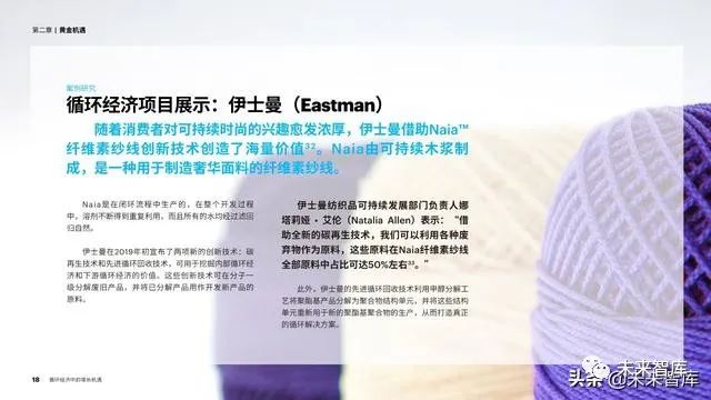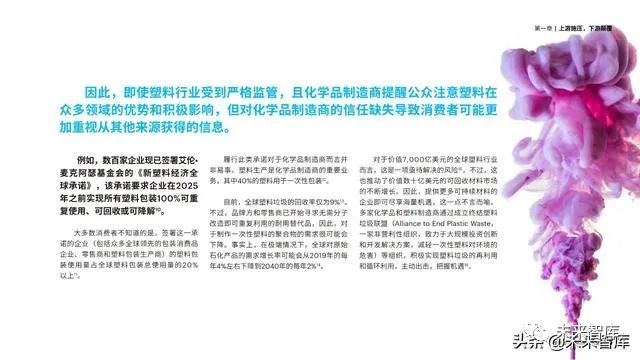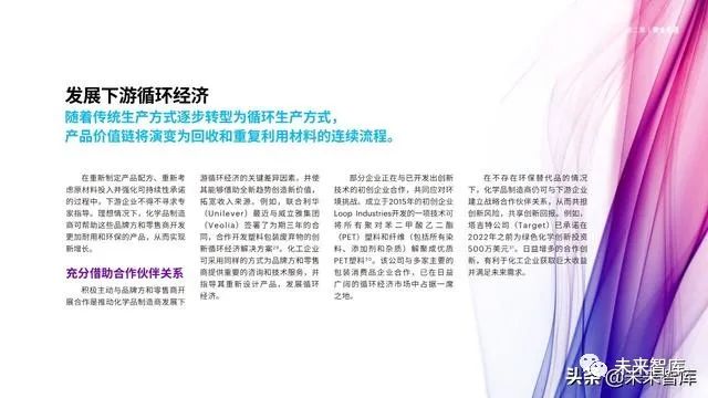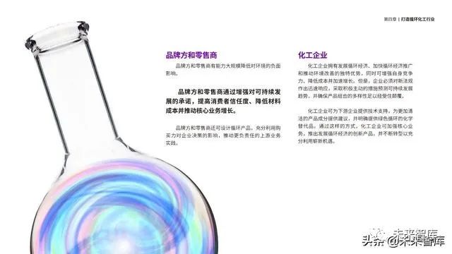 为此,下游行业(例如汽车、服装、电子产品、 食品和玩具)正在重新考虑产品的设计、包装和化学 品的使用,以将循环经济融入到整个产品生命周期中。
