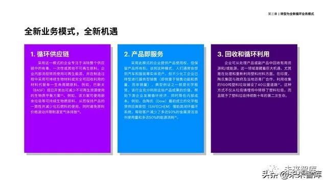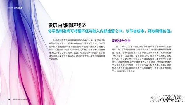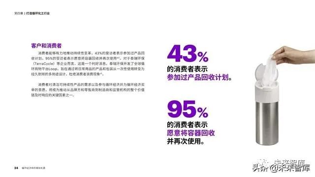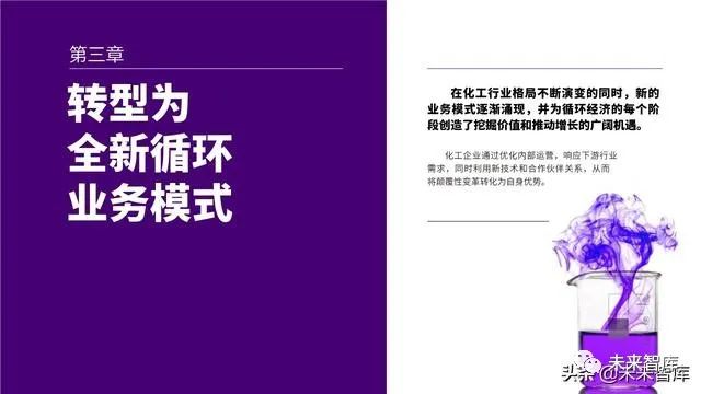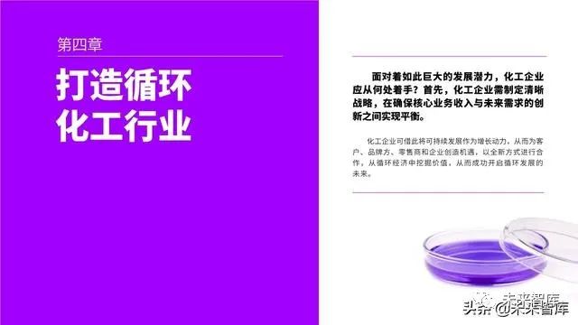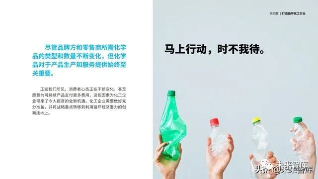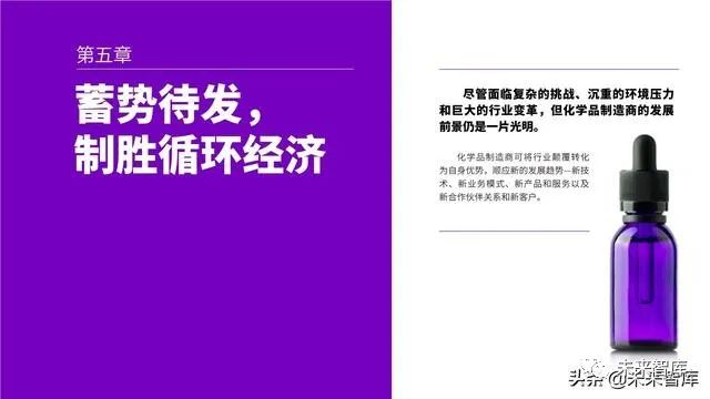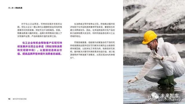 通过提高面向消费者的透明度、为制 造商提供更加环保的创新服务以及打造面 向利益相关者的明晰问责制度,化工企业 获得了得天独厚的优势,能够引领循环经 济转型并加快发展循环经济。增长机遇无 处不在,但观念的转变正在催生新的购买 行为,因此,企业必须迅速采取行动,否 则会面临被淘汰的风险。