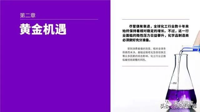化工行业于无形中影响着我们每一个人。目前, 全球范围内使用的化学品大约有10万种,从救生医疗 设备和个人护理用品,到食品、交通和服装,影响着 我们日常生活的方方面面2。这些化学品在全球的总行 业价值约4.7万亿美元3。如今,这一行业正处于发展 的转折点,颠覆性压力将推动全新业务模式和价值链 的涌现,同时为蓄势待发、制胜新趋势的积极践行者 创造机遇。