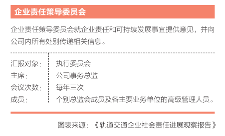 港铁推动社会责任与可持续发展工作的一大亮点,是将其纳入公司治理架构与日常运营之中,主要做法包括在公司董事局下设企业责任委员会,由董事局主席担任委员会主席;在公司执行委员会下设企业责任策导委员会,由公司事务总监任主席。由此,社会责任与可持续发展工作成为公司最高管理层的重要职责之一。