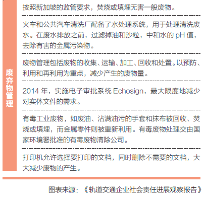 此外,新加坡地铁非常重视环境信息的披露,不仅在其社会责任报告中用大量的篇幅介绍企业的环境履责实践及成效,还在其官网开辟“鼓励环境可持续发展”栏目介绍企业的环境声明、环境管理及领先实践等内容。