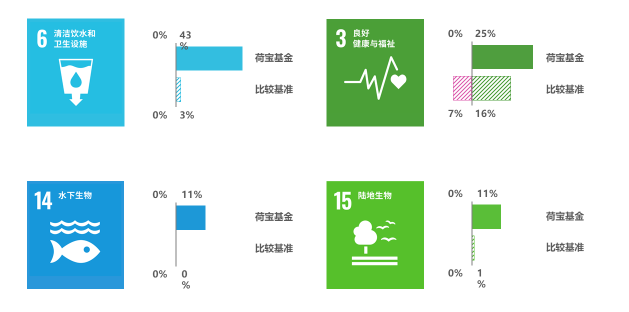 基于各企业的SDG得分,荷宝可得出基金的SDG得分,以反映基金的社会绩效。基金的社会绩效会和某指定基准相比,以显示其对SDG的推进情况。本基金以明晟世界指数作为比较基准,因其并非可持续性导向,故本基金在四个SDG上的绩效表现(实心部分),都远胜于基准指数(阴影部分)。